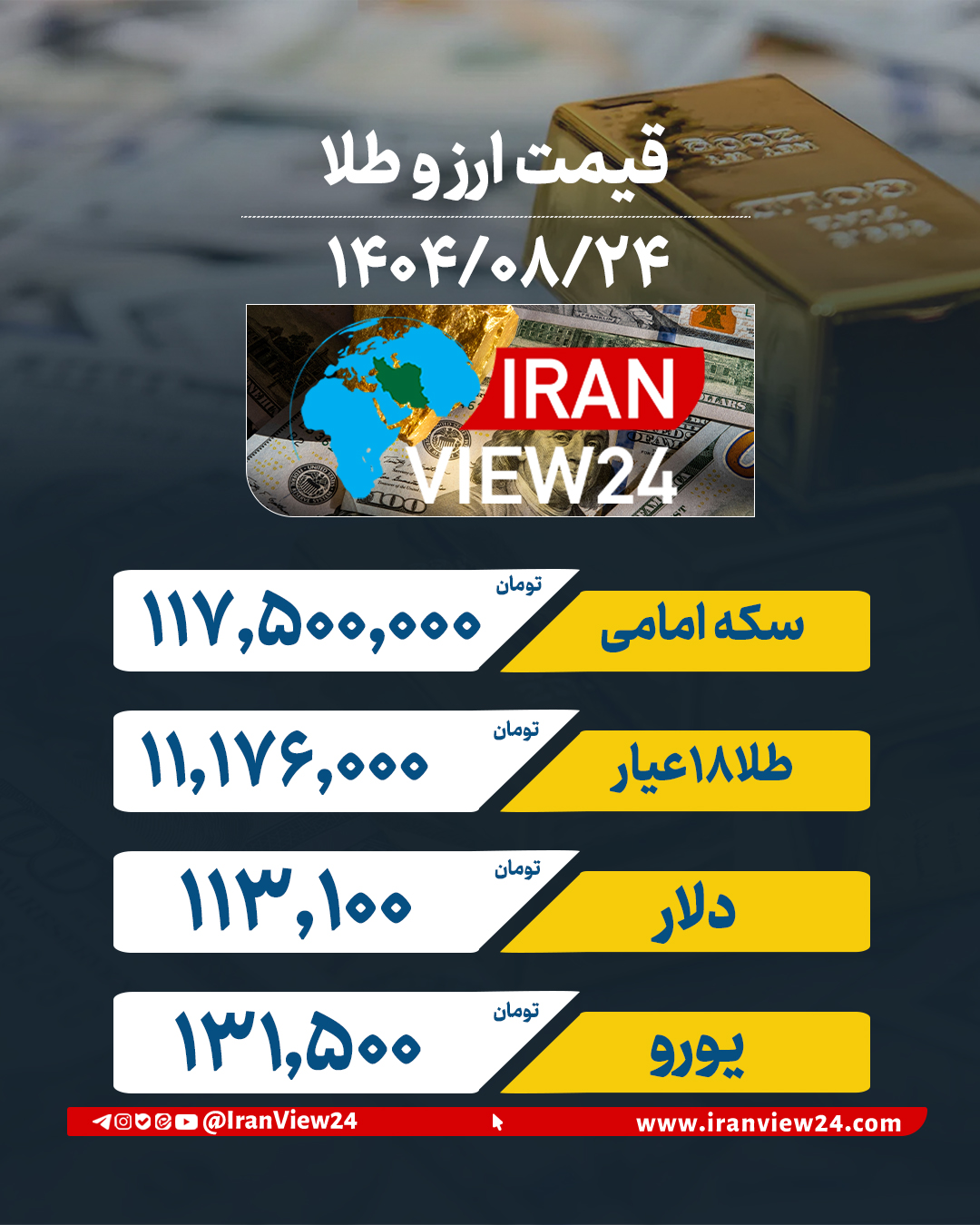بازار طلا و ارز امروز (۲۴ آبان ۱۴۰۴) با نزولی شدن قیمت سکه و طلا و ثبات نسبی نرخ ارز در مرکز مبادله همراه بود. هر گرم طلای ۱۸ عیار با کاهش ۰.۳۳ درصدی به حدود ۱۱ میلیون و ۱۷۶ هزار تومان رسید و سکه امامی نیز با افت ۱.۷ درصدی در محدوده ۱۱۷ میلیون و ۵۰۰ هزار تومان معامله شد. در مقابل، نرخ دلار مبادلهای در ۷۳ هزار و ۳۵۲ تومان بدون تغییر باقی ماند.