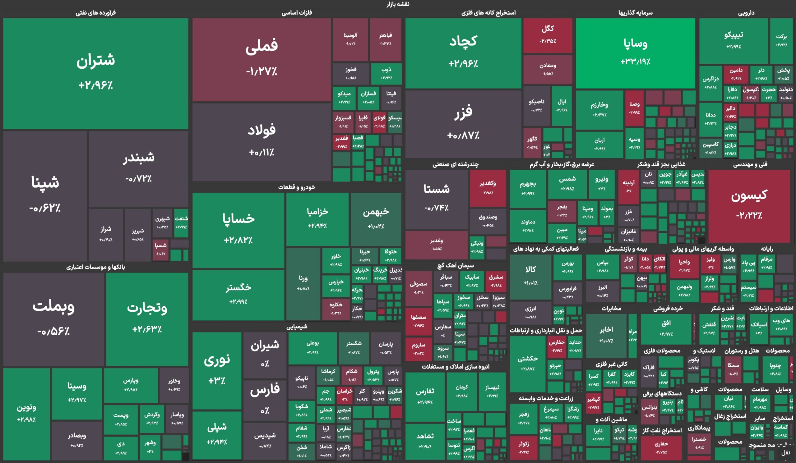 نماد فارس توانست بهتنهایی موجب رشد حدود چهار هزار واحدی شاخص شود، در حالیکه فملی با اثر منفی هزار و ۷۰۰ واحدی، در افت شاخص نقش داشت. پرتراکنشترین نمادهای امروز شامل شتران با حدود ۶۰۰ میلیارد تومان ارزش معاملات و نمادهای فولاد، فملی و شپنا با ارزش بیش از ۳۰۰ میلیارد تومان بودند.