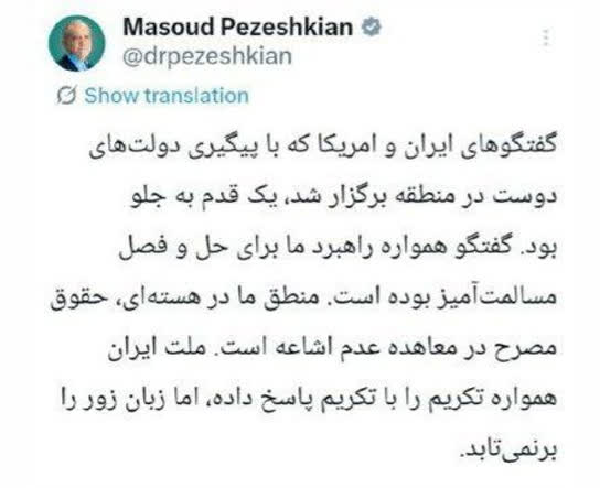 In a post on his X account, President Pezeshkian emphasized that diplomacy remains Tehran’s core strategy for peacefully resolving disputes. He underscored that Iran’s nuclear policy is guided by international law and rights enshrined in the Non-Proliferation Treaty.